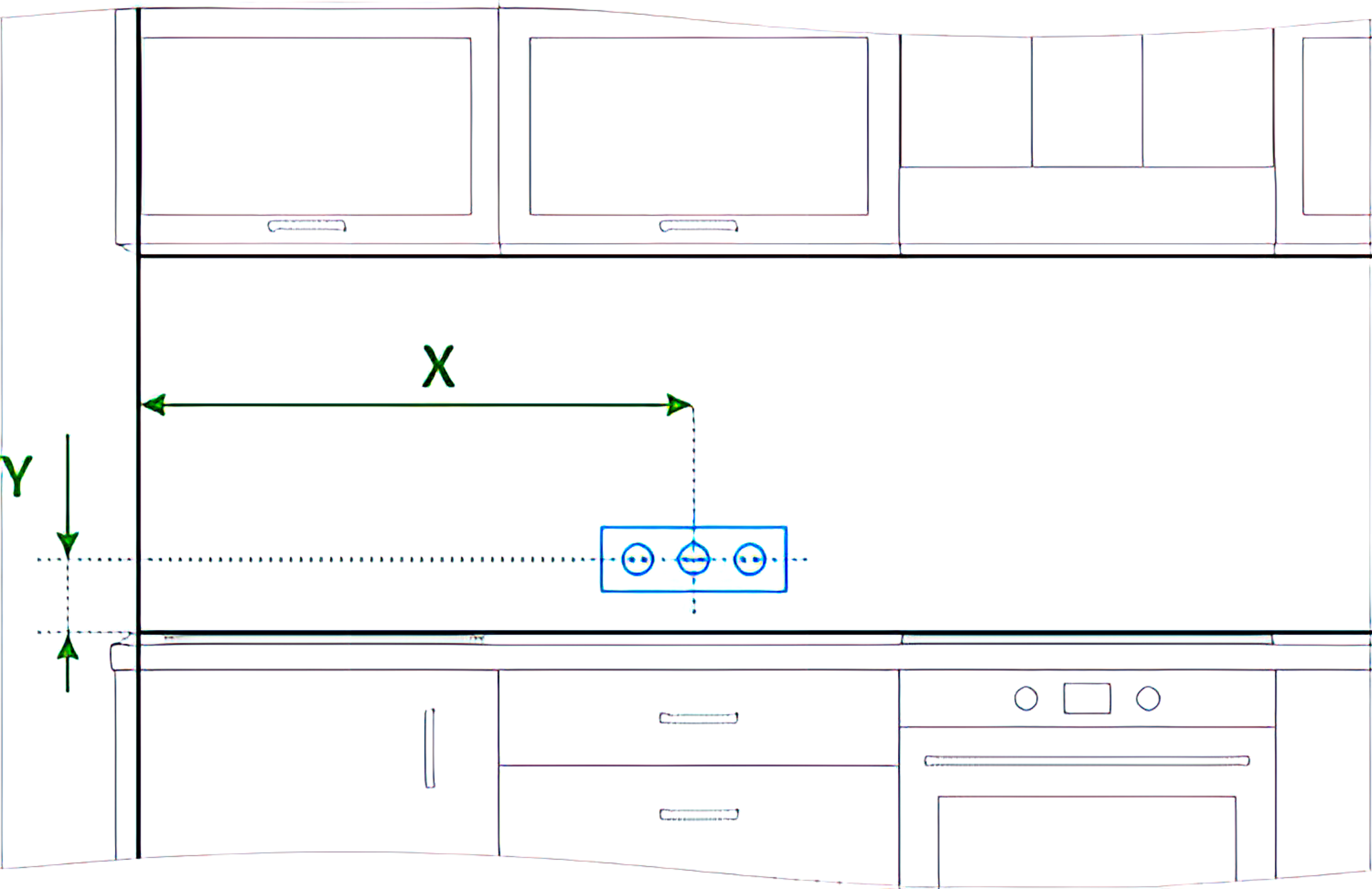 При отсутствии установленного гарнитура обязательно необходимо рассчитать уровень от пола до верхней плоскости столешницы – необходимо для точного определения расстояния от центра розетки до нижней кромки стеновой панели.