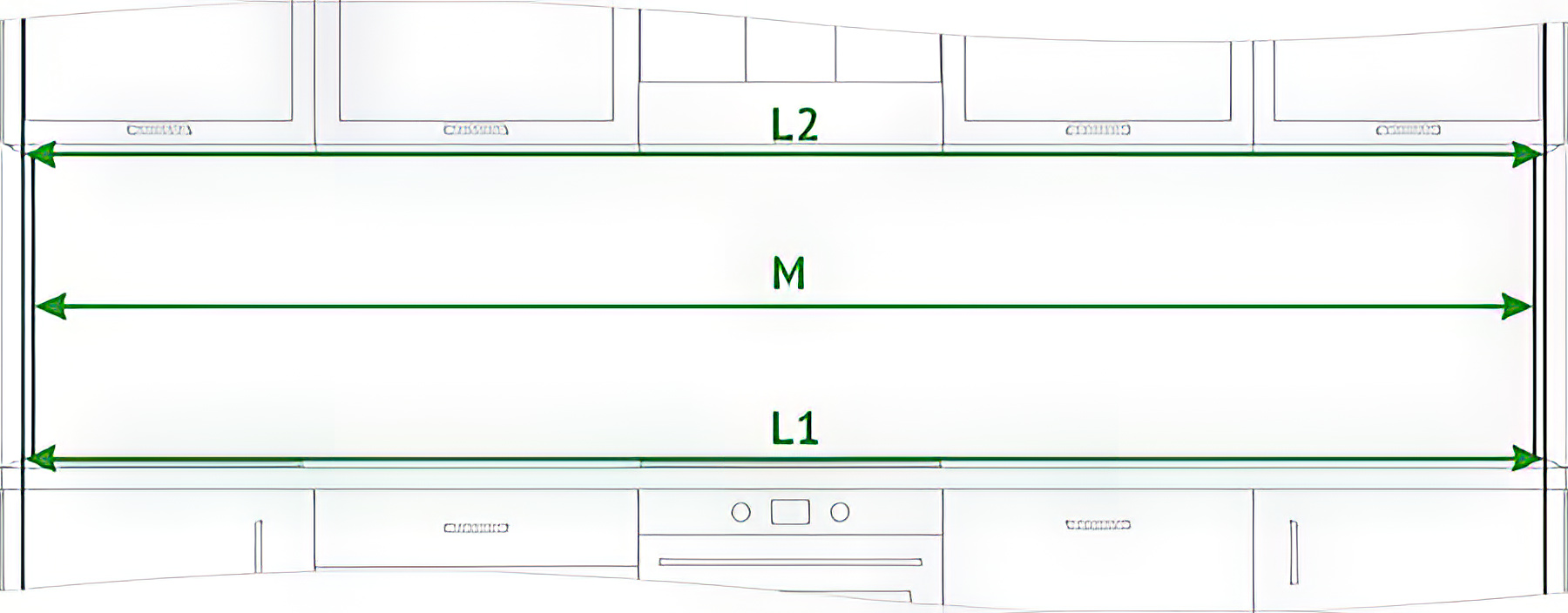При расчете длины и высоты изделия используются чистые размеры стены, при этом используется минимальное значение из группы замера (Рис. 1 и Рис. 4). Например, длина ниши для встраивания по нижнему краю составляет L1=2455 мм, по верхнему L2=2458 мм. В данном случае для расчета длины берется M=2455 мм.
