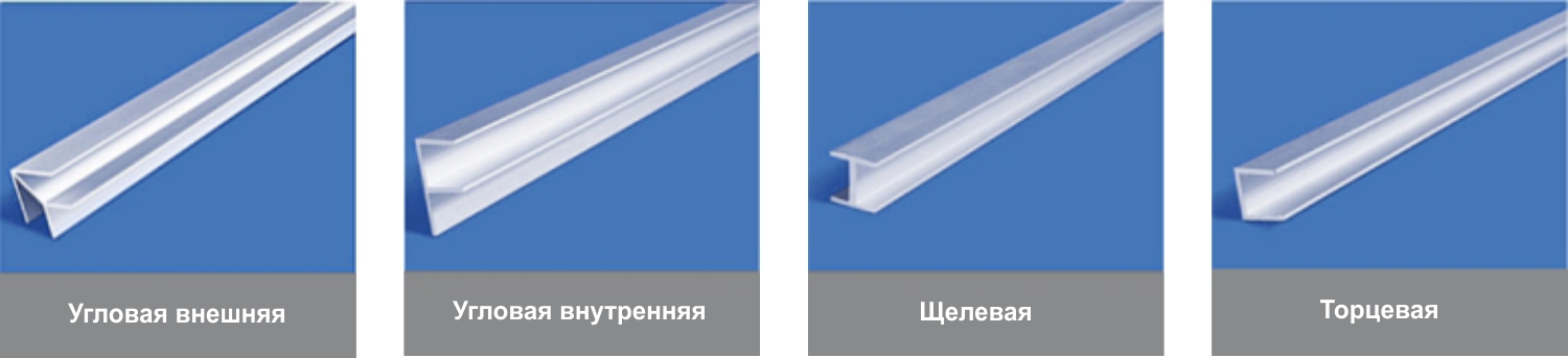 Для стыковки деталей изделия используются алюминиевые планки для стеновых панелей 4 мм. Они служат сдерживающим и декоративным элементом, стандартного формата 600 мм. Имеют матовое или глянцевое покрытие и применяются четырех видов, при необходимости поставляются в комплекте. Рис.6.